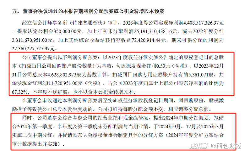 雅戈?duì)?023年年報(bào)顯示,公司董事會(huì)提出以下利潤分配預(yù)案:以2023年度權(quán)益分派實(shí)施公告確定的股權(quán)登記日的總股本(扣減當(dāng)日公司回購賬戶股份數(shù)量)為基數(shù),每股派發(fā)現(xiàn)金紅利0.50元(含稅);以2023年12月31日公司總股本4,628,802,973股為基數(shù)計(jì)算,扣減同日回購專用證券賬戶持有的5,361,071股,共派發(fā)現(xiàn)金紅利2,311,720,951.00元(含稅),占公司2023年度歸屬于上市公司股東凈利潤的比例為 67.32%。本年度不送紅股,也不以資本公積金轉(zhuǎn)增股本。