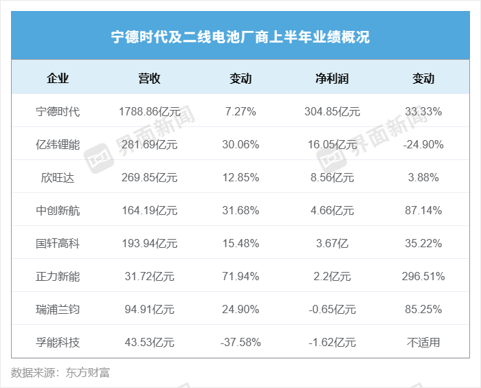 鋰電池企業期中考成績單公布,二線企業上半年整體業績同比改善,“寧王”繼續一大獨大。